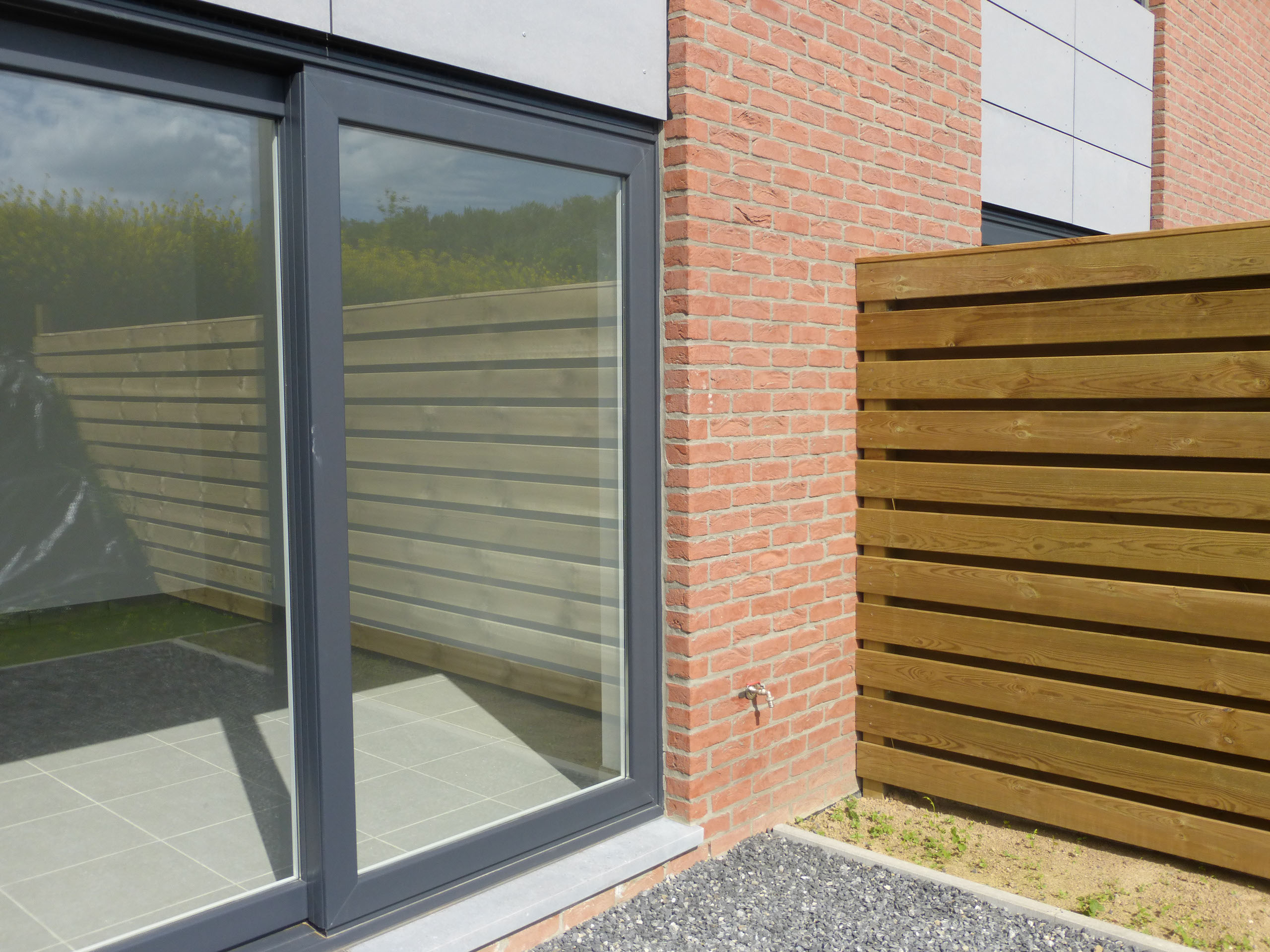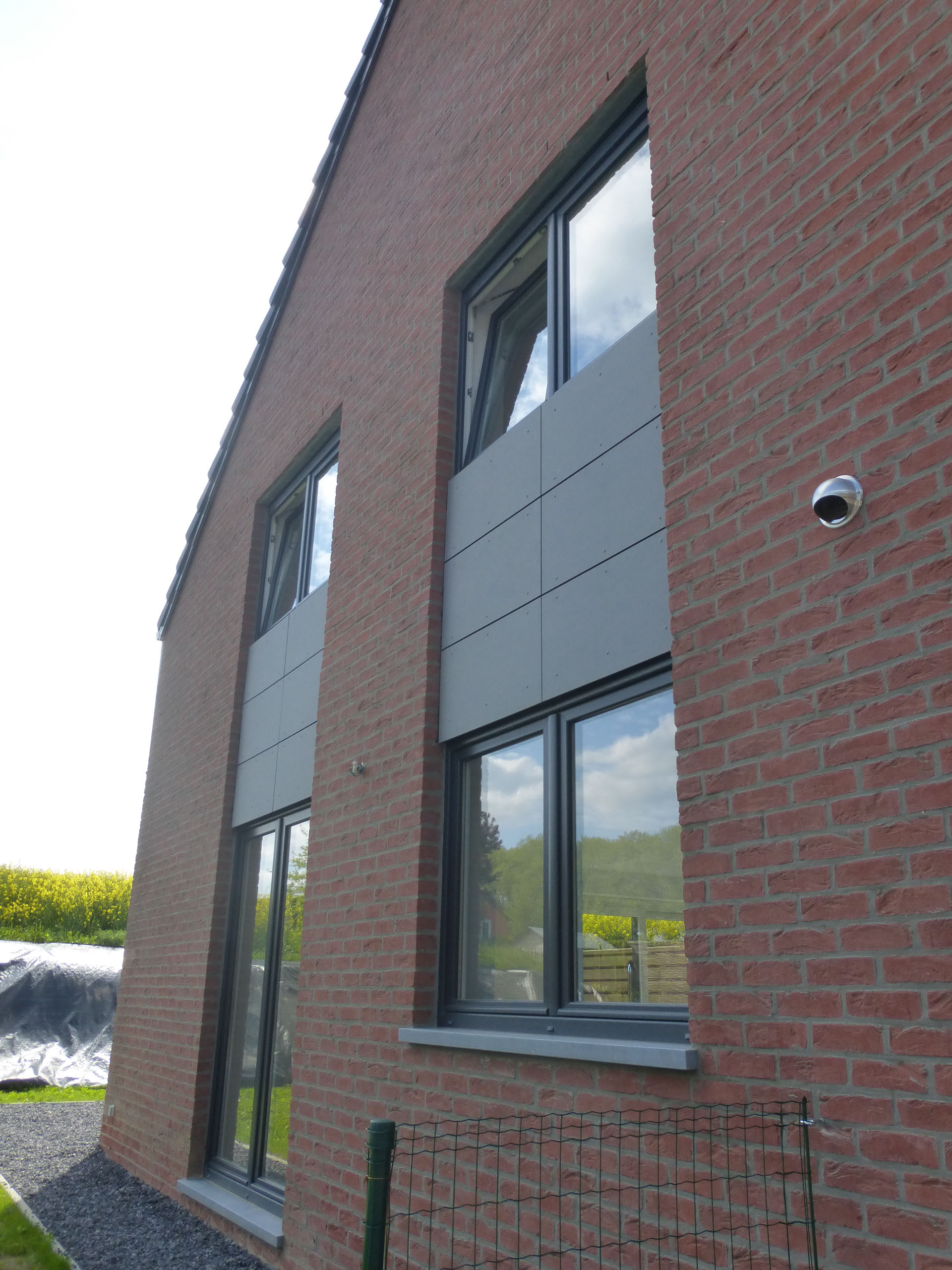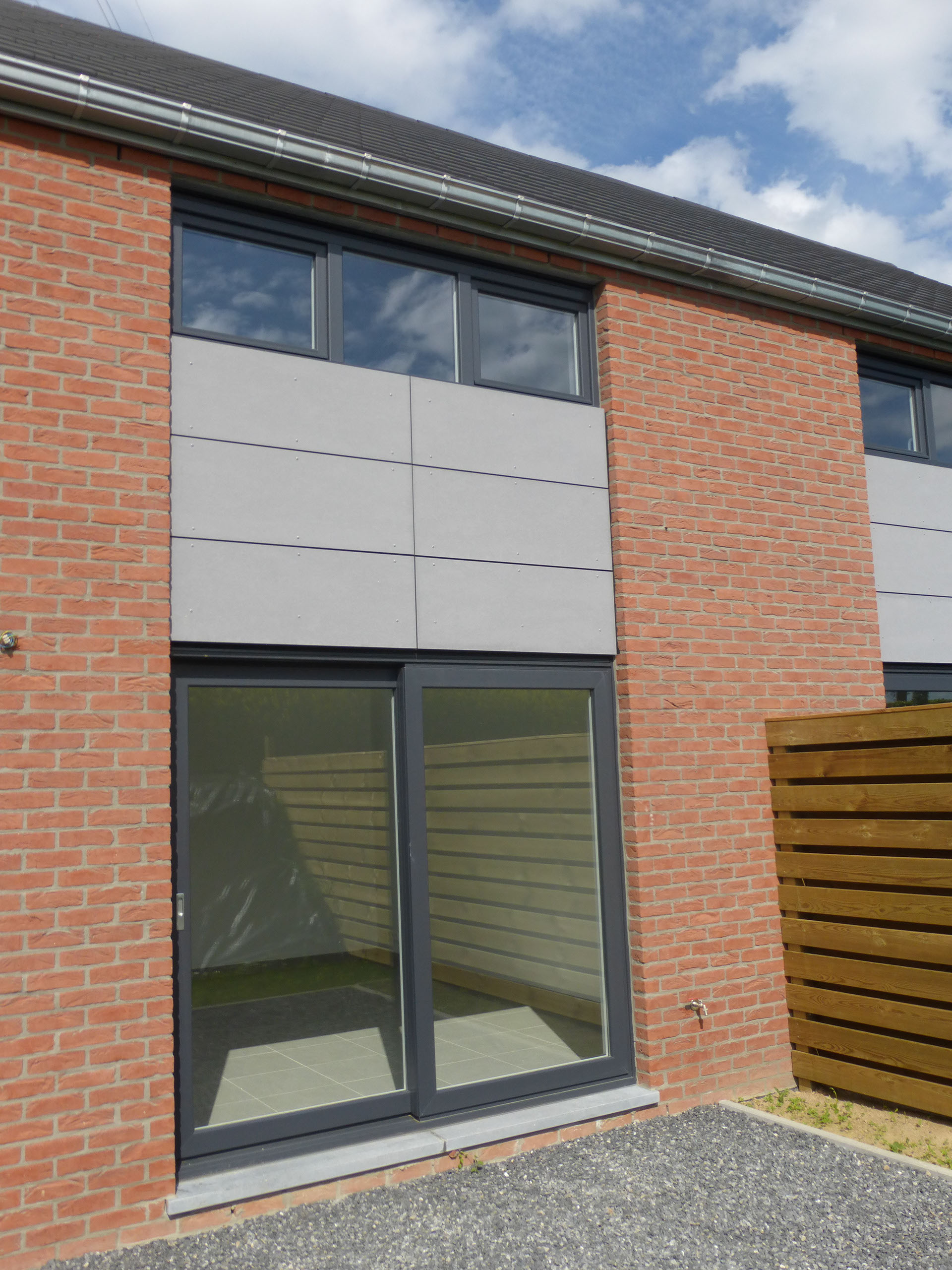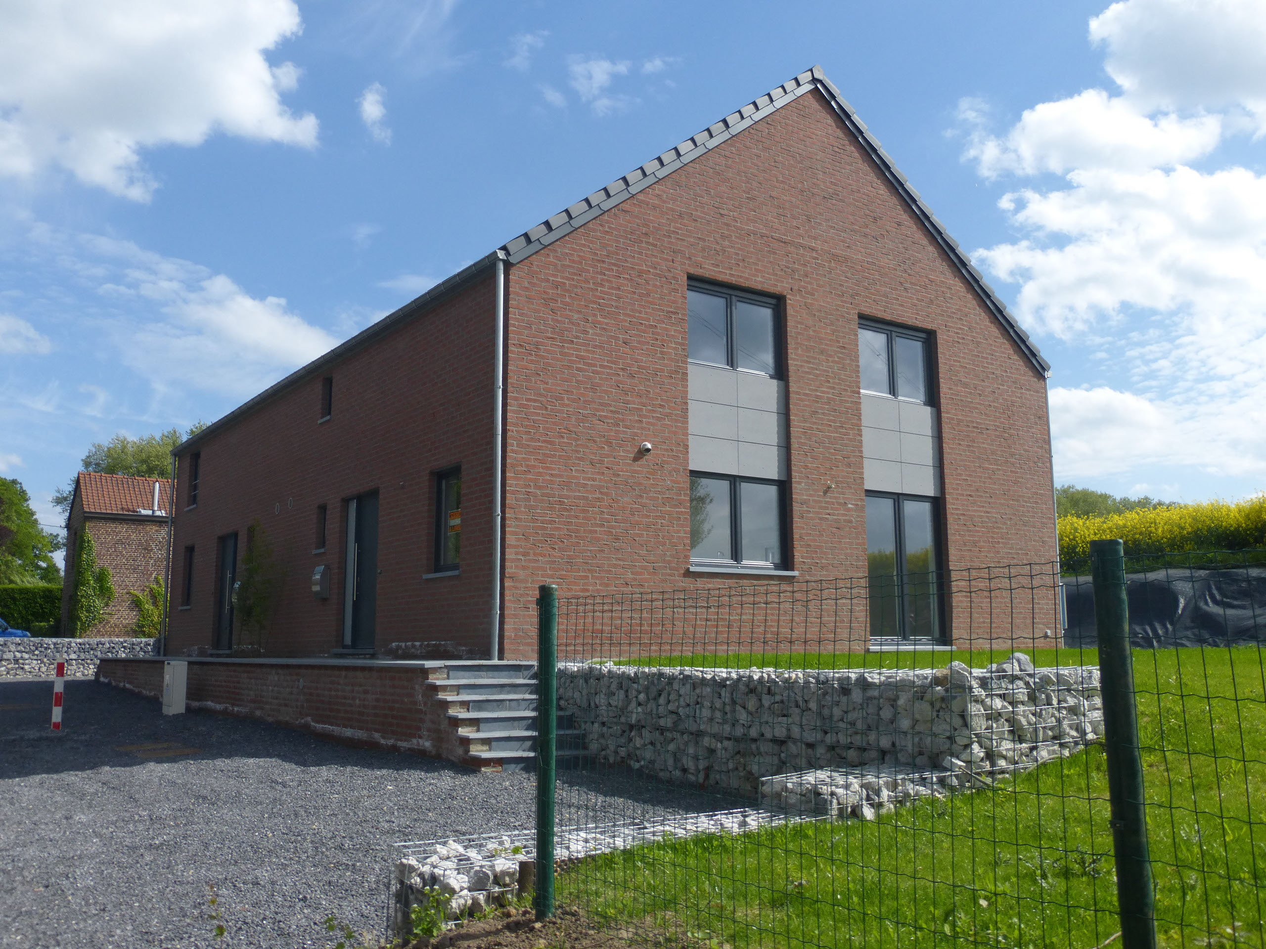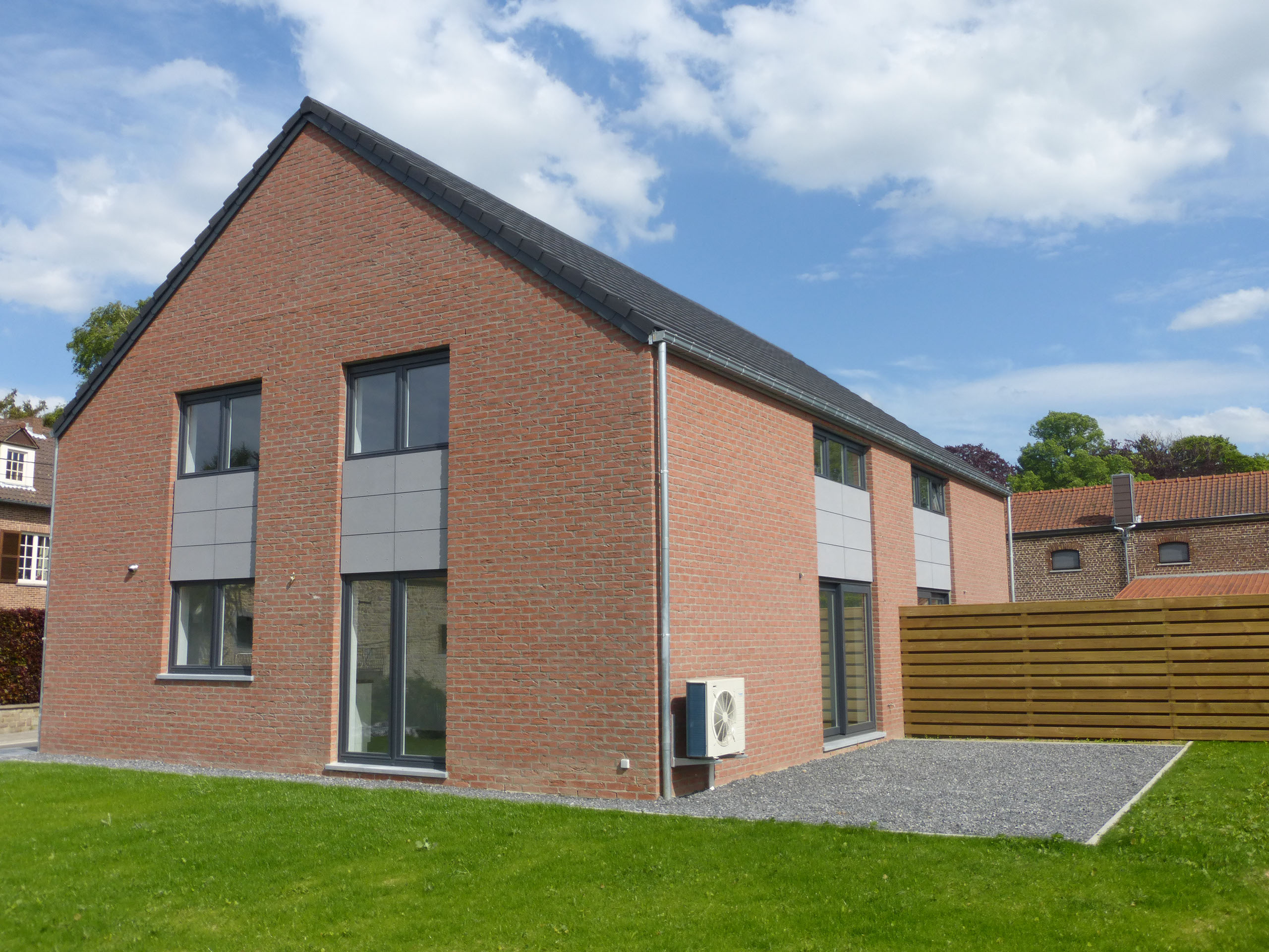 Double habitation construite sur 2 niveaux, en briques brunes et en tuiles noires, avec liaison des baies par panneaux en fibro-ciment.