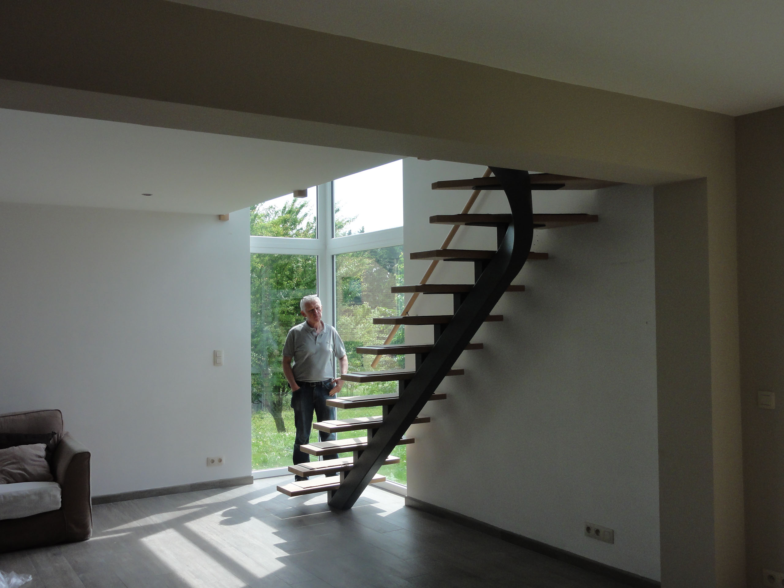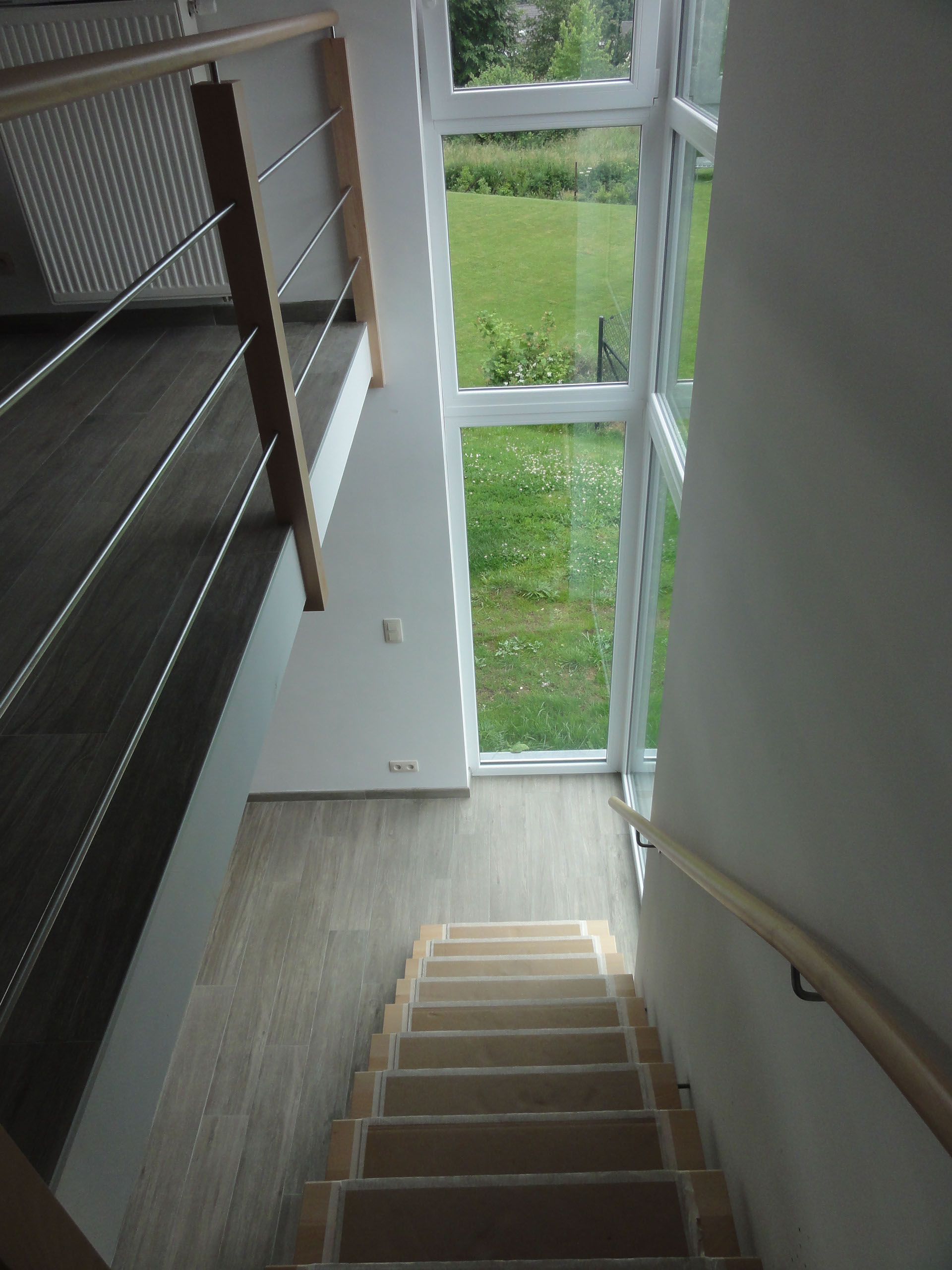 Bel escalier à limon central rendant accessible le bureau, en mezzaninne, depuis le salon.