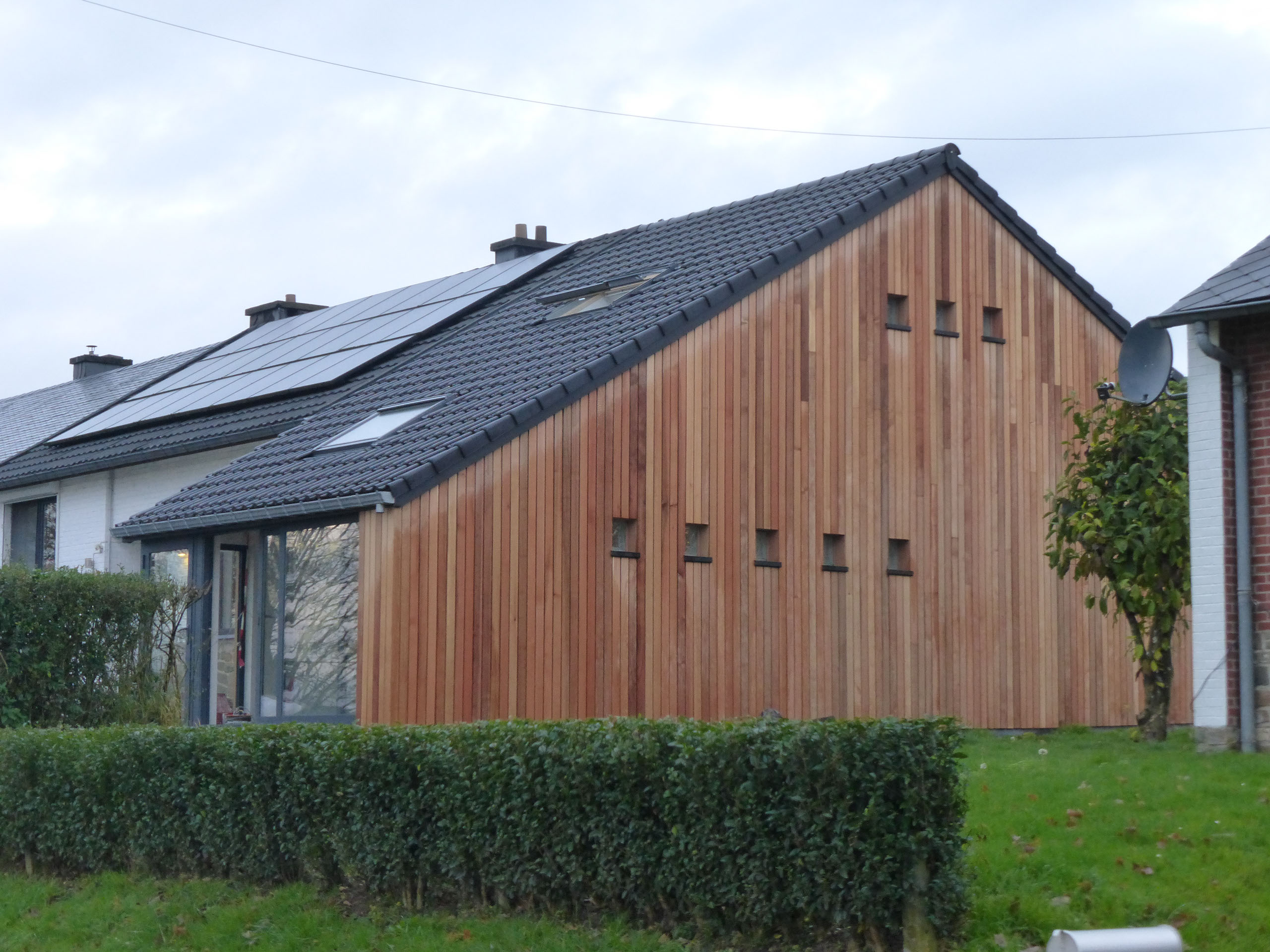 Extension réalisée en bardage de cèdre vertical, à claire-voie, fermée côté pignon (vers voisin) et largement ouverte côté vue, avec larges baies vitrées donnant sur la terrasse d'accès.