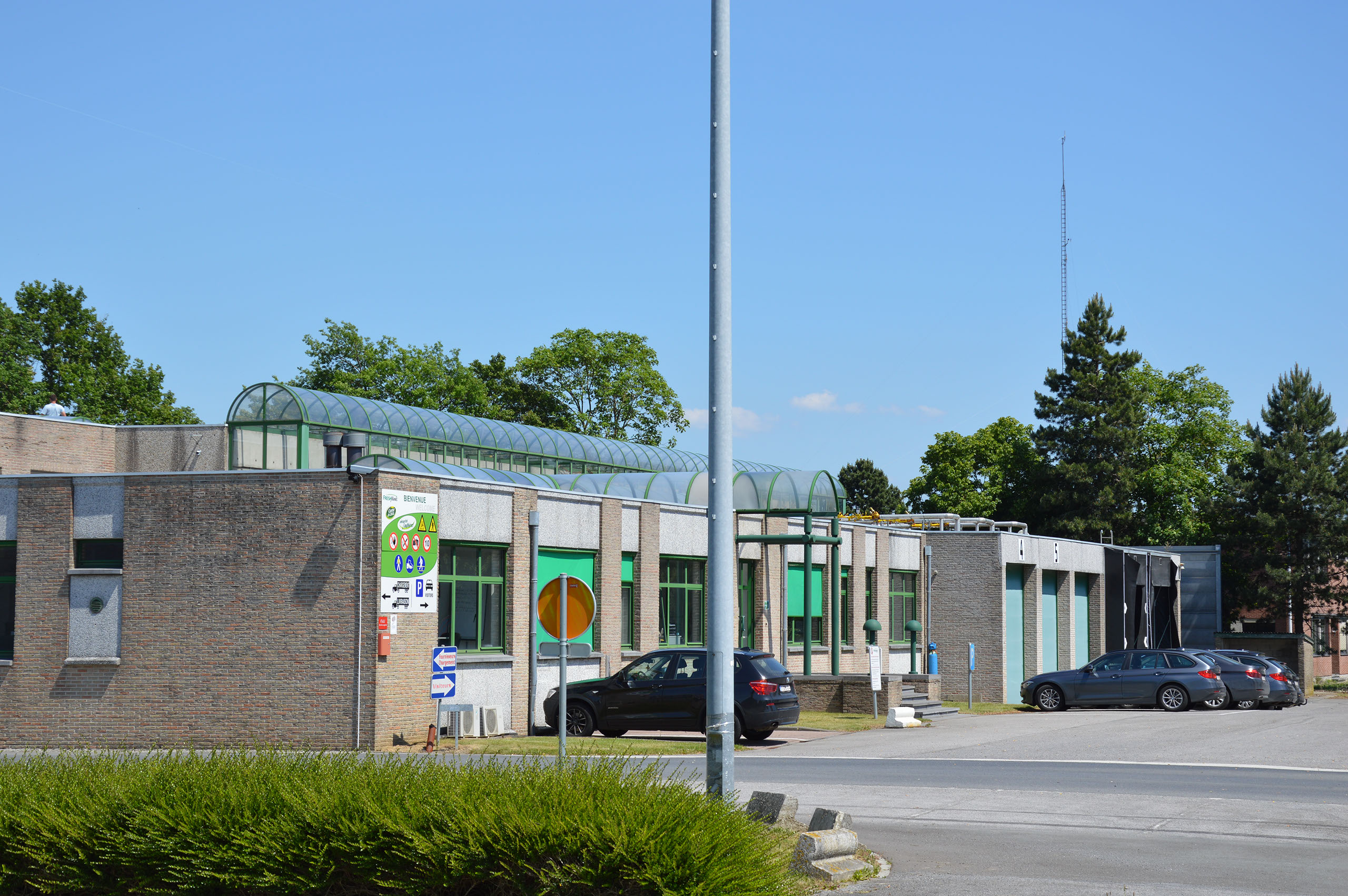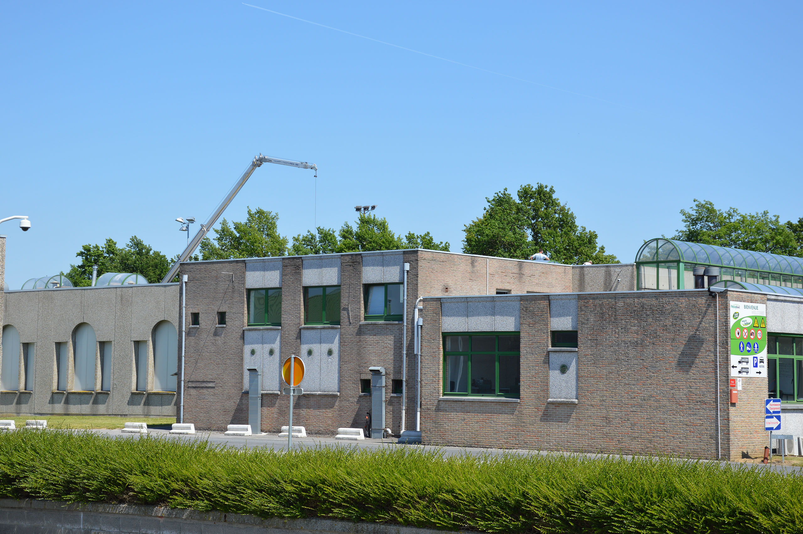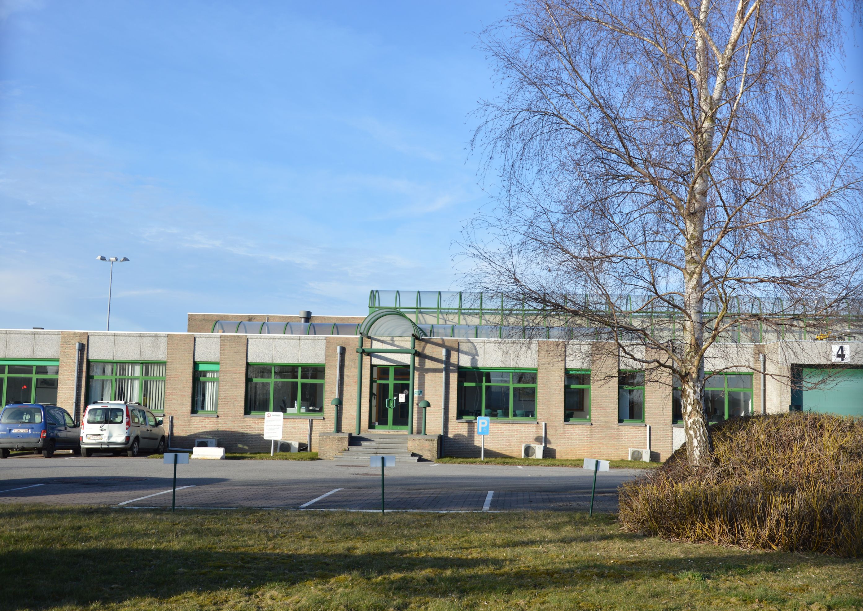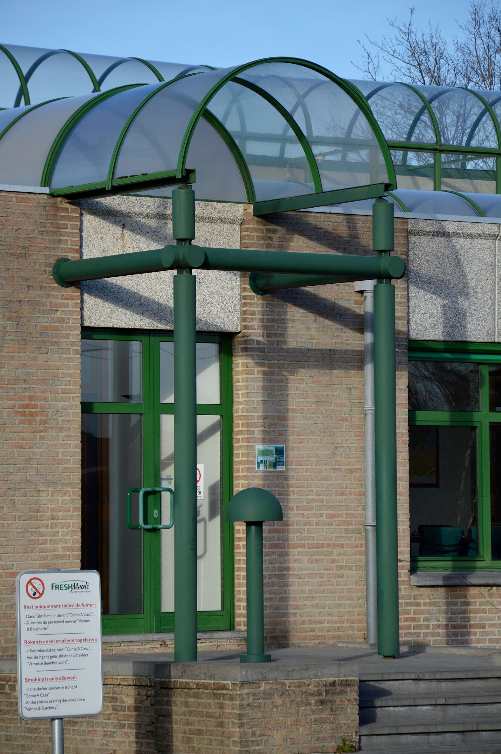 bâtiments semi-préfabriqués pour les ateliers, avec panneaux en béton de silex lavé; bâtiments traditionnels pour les bureaux, avec façades en briques & panneaux et verrières cintrées en ALU avec auvent d'entrée assorti, en acier peint;