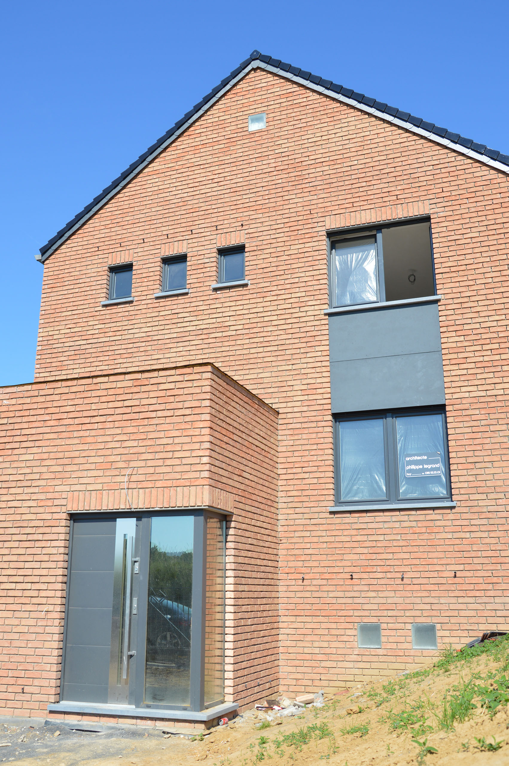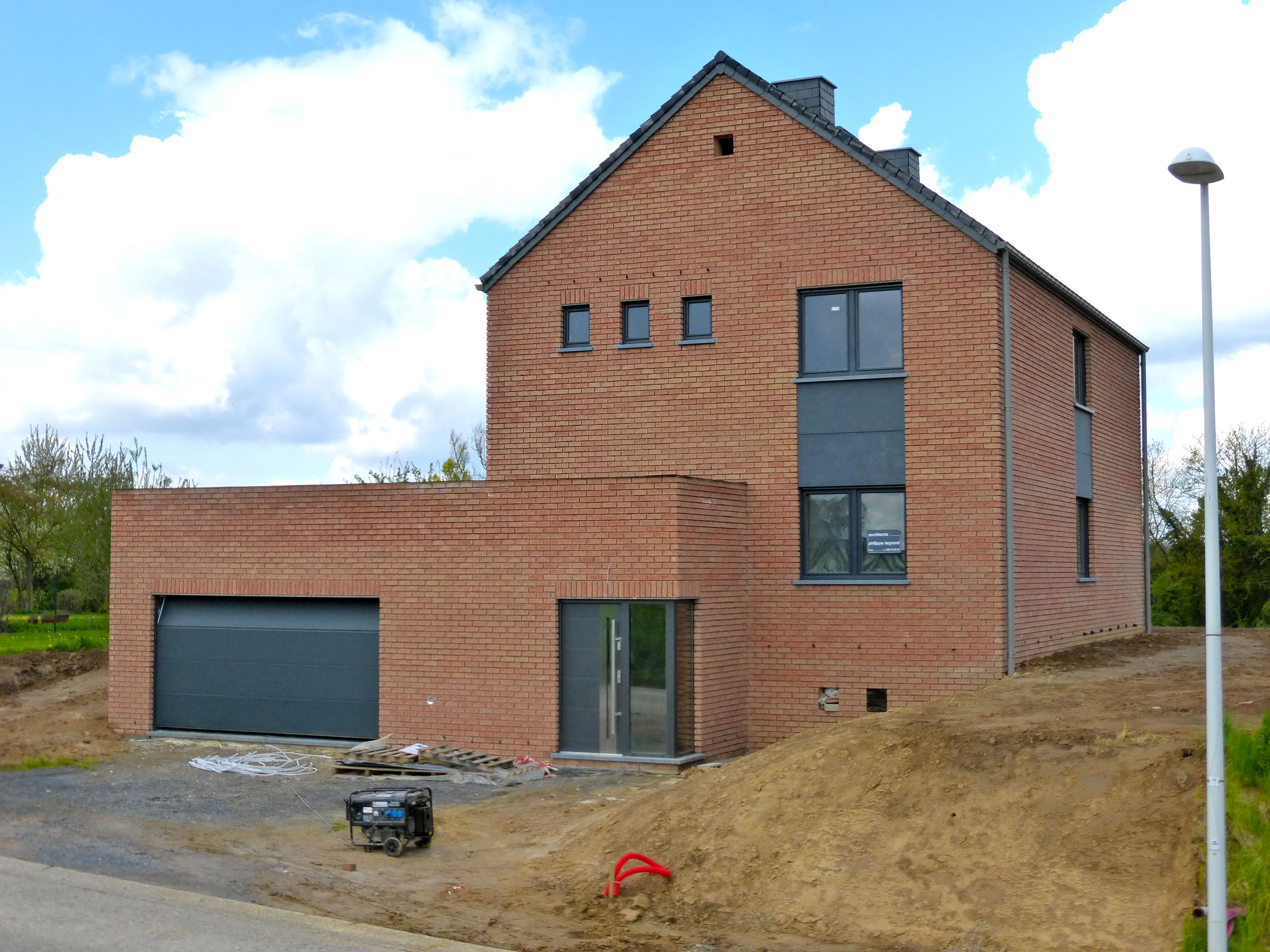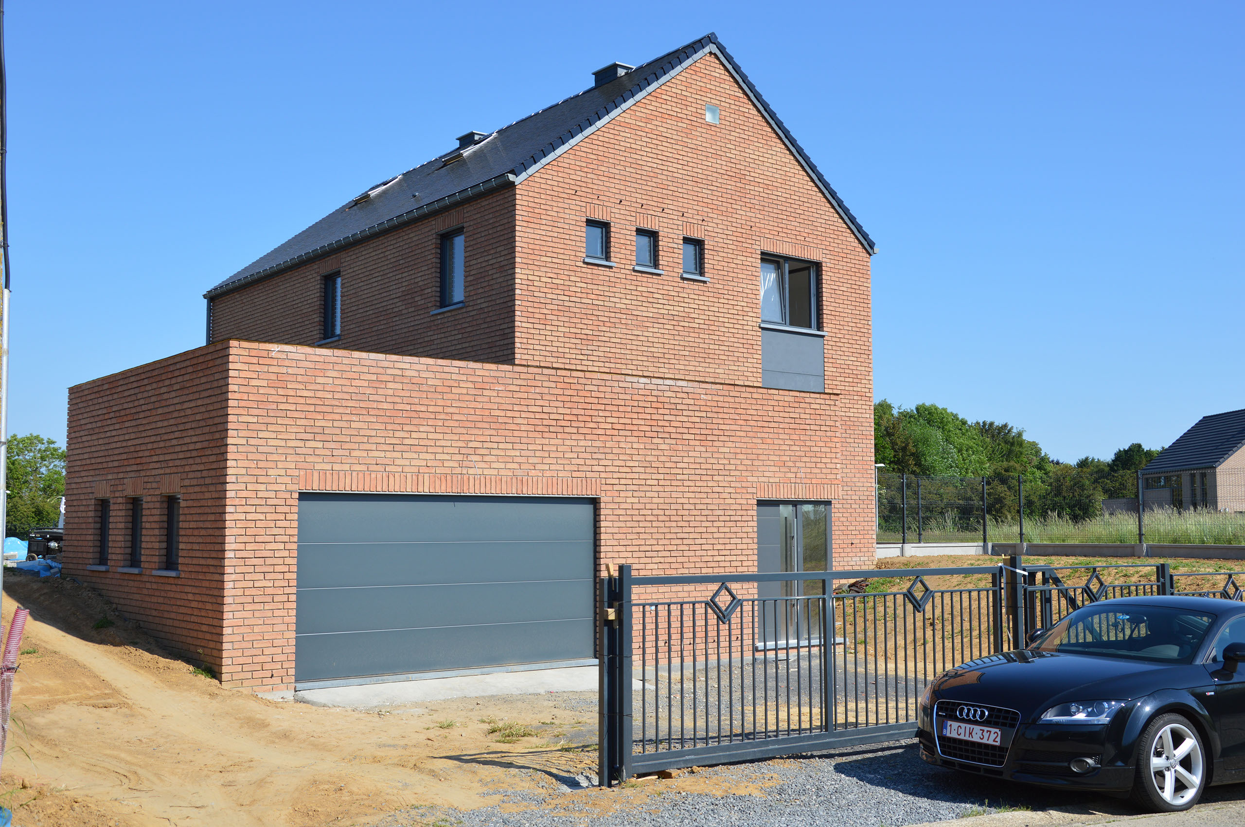 Immeuble de 3 niveaux et demi, comprenant un volume principal en briques rouges à usage d'habitation, avec toiture en tuiles plates, et un volume secondaire assorti, avec toiture plate-forme, à usage de garage et de hall d'entrée & vestiaire