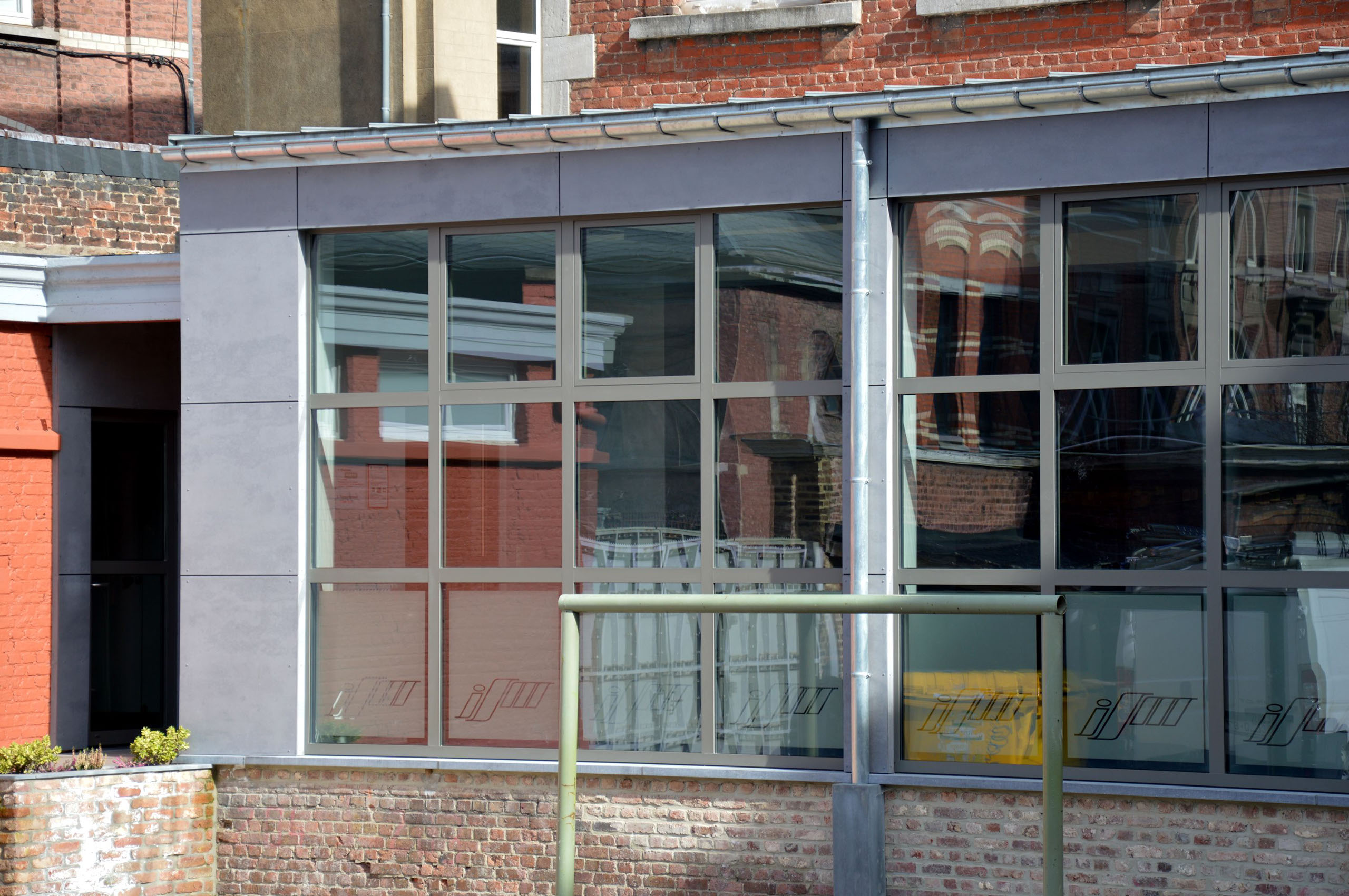 Reprise de la haute façade de l'immeuble existant à l'aide de 3 colonnes, afin de libérer le rez et créer ainsi l'agrandissement souhaité.