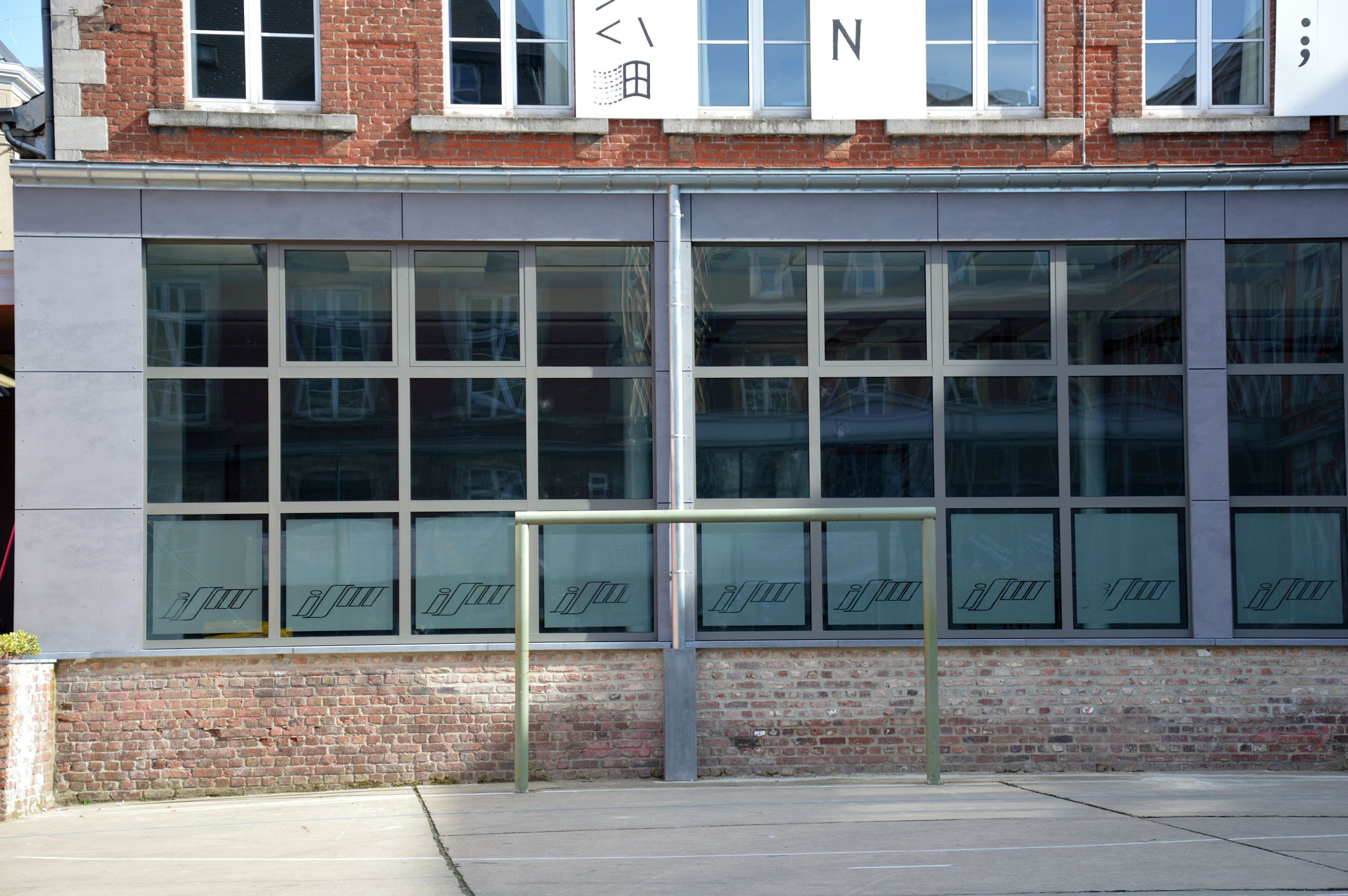 Intégration dans le contexte existant par façade transparente tournée vers la cour principale, côté accès.